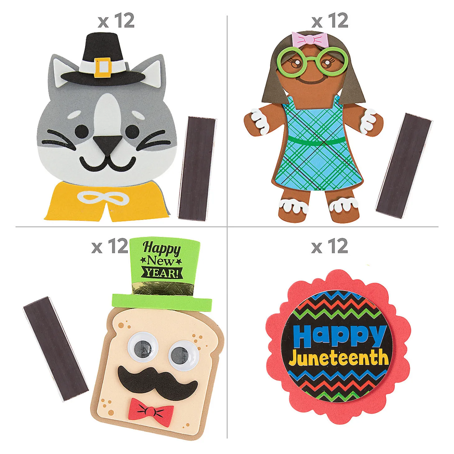From Celebrating New Years To Christmas And Everything In Between, This Convenient Kit Has Everything You Need! This Kit Is Packed With An Assortment Of Fun Craft Projects Perfect For Younger Children. They’Re Great Holiday Activities For The Classroom And Daycare That Kids Will Love Bringing Home To Display On Their Fridge As Colorful Decorations! (120 Pcs. Per Unit) Makes 120. All Craft Kit Pieces Are Pre-Packaged For Individual Use. Magnets Are Packaged Separately. Do Not Discard. Kits Include Instructions.Includes:• 12 Americado Magnet Craft Kits (Includes Self-Adhesive Foam Pieces. 3 3/4″ X 4″)• 12 Juneteenth Magnet Craft Kits (Includes Self-Adhesive Foam Pieces. 3 1/2″ X 3 1/2″)• 12 St. Patrick’s Day Cool Leprechaun Magnet Craft Kits (Includes Self-Adhesive Foam Pieces And Foil Stickers. 3″ X 4 1/2″)• 12 Silly Fiesta Food Magnet Craft Kits (Includes Self-Adhesive Foam Pieces And Plastic Googly Eyes. 3 3/4″ – 4″ X 3 1/4″ – 3 1/2″)• 12 Happy Easter Magnet Craft Kits (Includes Self-Adhesive Foam Pieces. 5″)• 12 New Year’s Toast Magnet Craft Kits (Includes Self-Adhesive Foam Pieces, Plastic Googly Eyes And Foil Stickers. 2 3/4″ X 4 1/2″)• 12 Silly Gingerbread Magnet Craft Kits (Includes Self-Adhesive Foam Pieces. 4 3/4″ X 6 1/2″)• 12 Silly Werewolf Magnet Craft Kits (Includes Self-Adhesive Foam Pieces. 3 1/2″ X 4 3/4″)• 12 Thanksgiving Pet Magnet Craft Kits (Includes Self-Adhesive Foam Pieces. 4 1/2″)• 12 Valentine Armadillo Magnet Craft Kits (Includes Self-Adhesive Foam Pieces And Plastic Googly Eyes. 3 1/2″ – 4 1/2″ X 2 1/2″ – 2 3/4″)• Assortments Are Subject To Change At Any Time And May Vary From Picture Shown. Substituted Items Will Be Similar In Nature.