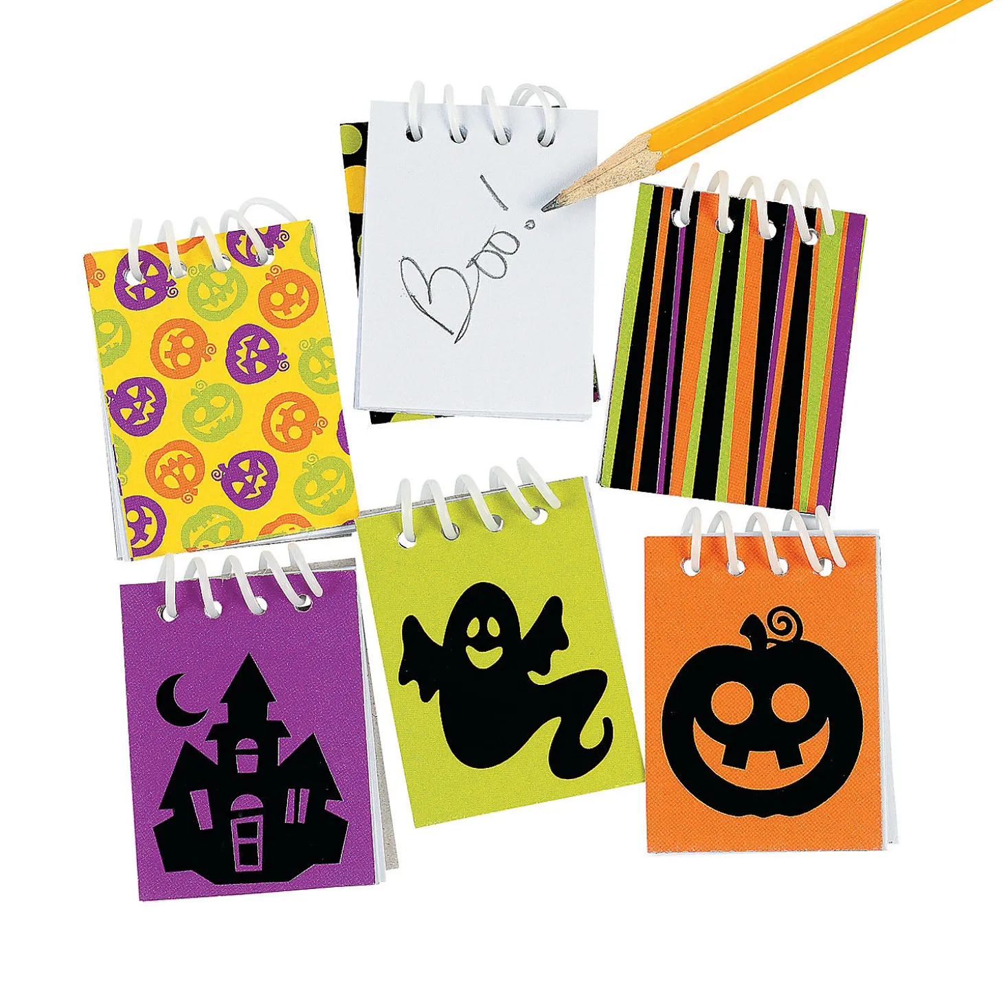 Mini Iconic Halloween Spiral Notepads. A Fun Idea For Halloween Giveaways, These Mini Iconic Halloween Spiral Notepads Come In A Variety Of Colorful Spooky Designs! Includes Mini Jack-O’-Lanterns, Polka Dots, Stripes, Haunted Houses, Ghosts And Jack-O’-Lanterns. Write Notes To Your Friends On These Adorable Memo Pads Or Give Them As Gifts At Your Halloween Party. Great For Trick-Or-Treaters, Too! (4 Dozen Per Unit) 1 1/2″ X 2″ 25 Pgs. © Otc
