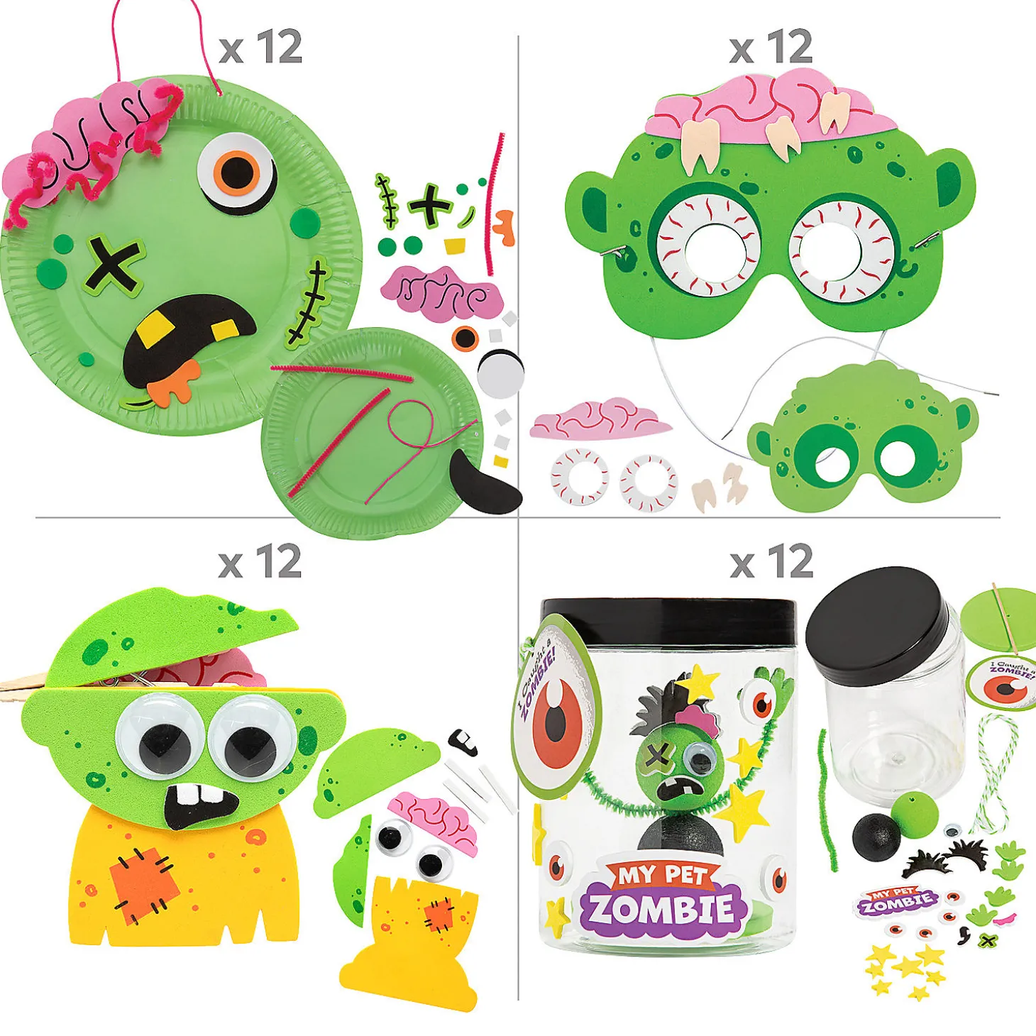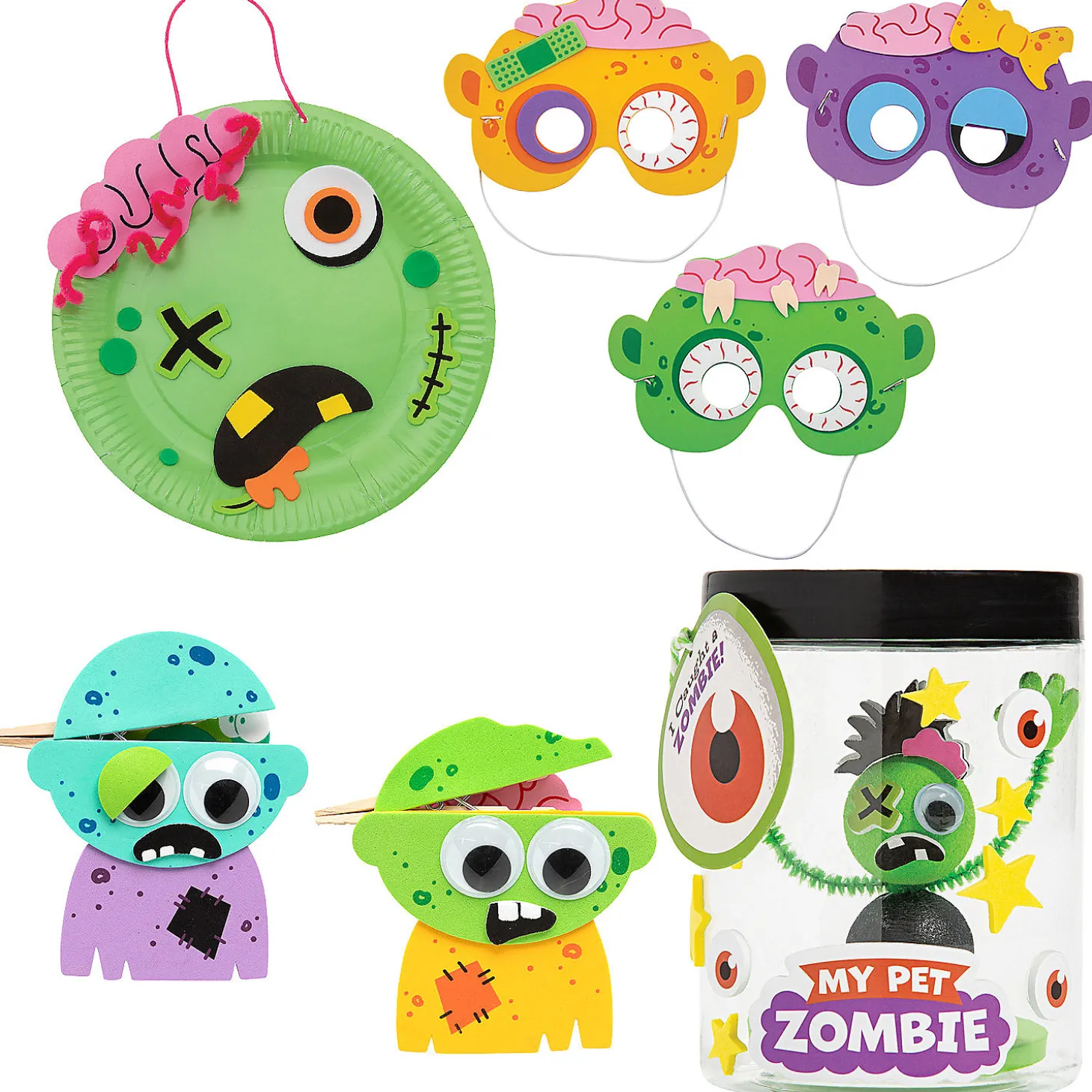 Bring Kids’ Zest For Creativity Back To Life! A Great Alternative To Brain-Sucking Screen Time, These Crafts Help To Get Their Mental Wheels Spinning. This Collection Of Various Zombie-Themed Crafts Also Makes A Great Brain Break Classroom Activity, A Fun Halloween Party Craft Or An Entertaining Handout For School Or Community Trunk-Or-Treat Events. (48 Pcs. Per Unit) All Craft Kit Pieces Are Pre-Packaged For Individual Use. Kits Include Instructions.Includes:• 12 Paper Plate Zombie Sign Craft Kits (Includes Self-Adhesive Foam Pieces, Paper Plates, Chenille Stems And Satin Cording. 9″ Diam.)• 12 Zombie Chomper Clothespin Craft Kits (Includes Clothespins, Self-Adhesive Foam Pieces And Googly Eyes. 4 1/4 X 4″)• 12 Pet Zombie In A Jar Thanksgiving Craft Kits (Includes Self-Adhesive Foam Pieces, Googly Eyes, Baker’s Twine, Wooden Dowel And Plastic Jar With Lid. 3″ X 3″ X 4″)• 12 Zombie Mask Craft Kits (Includes Self-Adhesive Foam Pieces And Elastic Cording. 8 3/4″ X 5 3/4″)• Assortments Are Subject To Change At Any Time And May Vary From Picture Shown. Substituted Items Will Be Similar In Nature.