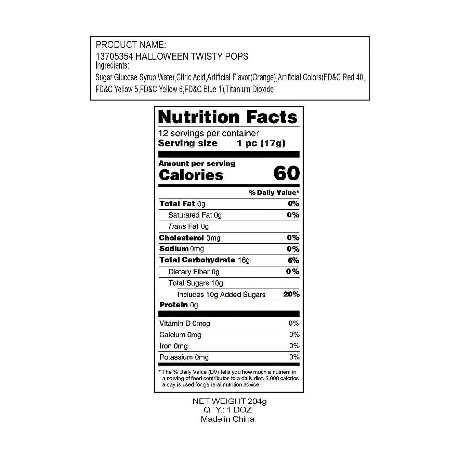 • Goody Bag Fillers: Add A Sweet Surprise To Your Halloween Party Goody Bags By Stuffing Them With Pieces Of Candy Or Other Edible Goodies, Ensuring That Each Guest Leaves With A Delightful Treat To Enjoy Later.• Scary Snack Attack: Fill Up Your Halloween Treat Bowls With Our Delicious Candy Or Treat Options, Delighting Trick-Or-Treaters And Party Guests With A Tempting Assortment Of Goodies.• Spooktacular Candy Buffet: Create A Spine-Chilling Candy Buffet With Our Vast Selection Of Sweets, Offering A Variety Of Flavors, Colors, And Textures That Will Leave Your Guests In Awe.Product Description:Tastes Like Halloween! Add These To Your Halloween Party Favor Bags Or Set Them Out For Your Party Guests To Enjoy! These Also Make A Great Addition To Your Halloween Candy For Special Trick-Or-Treaters! Individually Wrapped. Fat-Free. • Candy Is Non-Returnable. For More Information, Visit Our “Return Policy” Page Located On Our Website.• Ingredient, Nutrition, Allergen And Other Product Information Are Provided On Our Web And Mobile Sites For Reference Purpose Only, Without Warranty Or Representation As To Accuracy. Manufacturers Adjust Their Labeling Regularly And Are Solely Responsible For The Accuracy Of The Information. For General Questions Concerning These Items, Please Contact Our Customer Service At 800-228-0475.Size: Includes A 3 1/2″ Sucker On A 6″ Plastic Stick. Total Wt., 7 Oz.Quantity: 12Orange Flavor.