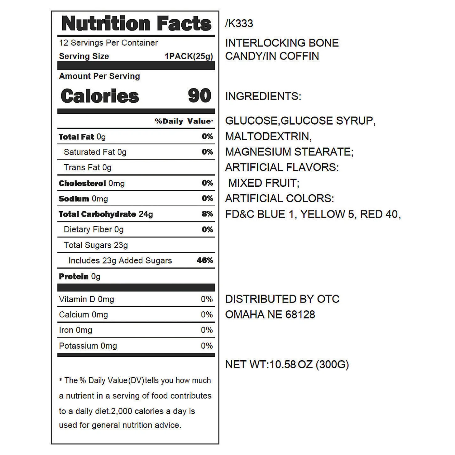 • Goody Bag Fillers: Add A Sweet Surprise To Your Halloween Party Goody Bags By Stuffing Them With Pieces Of Candy Or Other Edible Goodies, Ensuring That Each Guest Leaves With A Delightful Treat To Enjoy Later.• Creative Candy Crafting: Let Your Creativity Run Wild By Using Our Candies As Unique Craft Supplies, Creating Edible Jewelry, Colorful Mosaics, Or Whimsical Scenes That Will Amaze Your Guests.• Tasty Options For Trunk-Or-Treat: Find 1000S Of Delectable Candy And Treat Options On Our Website To Fill Up Your Handout Buckets And Delight Kids Of All Ages.Product Description:Trick Or Treat — These Candies Can’T Be Beat! These Packs Let Kids Have Fun Playing With Their Food On Halloween. Find Even More Fun Halloween Candy Online! Fat-Free. • Candy Is Non-Returnable. For More Information, Visit Our “Return Policy” Page Located On Our Website.• Ingredient, Nutrition, Allergen And Other Product Information Are Provided On Our Web And Mobile Sites For Reference Purpose Only, Without Warranty Or Representation As To Accuracy. Manufacturers Adjust Their Labeling Regularly And Are Solely Responsible For The Accuracy Of The Information. For General Questions Concerning These Items, Please Contact Our Customer Service At 800-228-0475.Size: Each 4″ Plastic Coffin Contains Interlocking Bones That Connect To Build One 4 1/2″ Candy Skeleton. Total Wt., 11 Oz.Quantity: Approx. 12 Pcs. Per Pack/12 Packs Per Unitassorted Fruit Flavors.