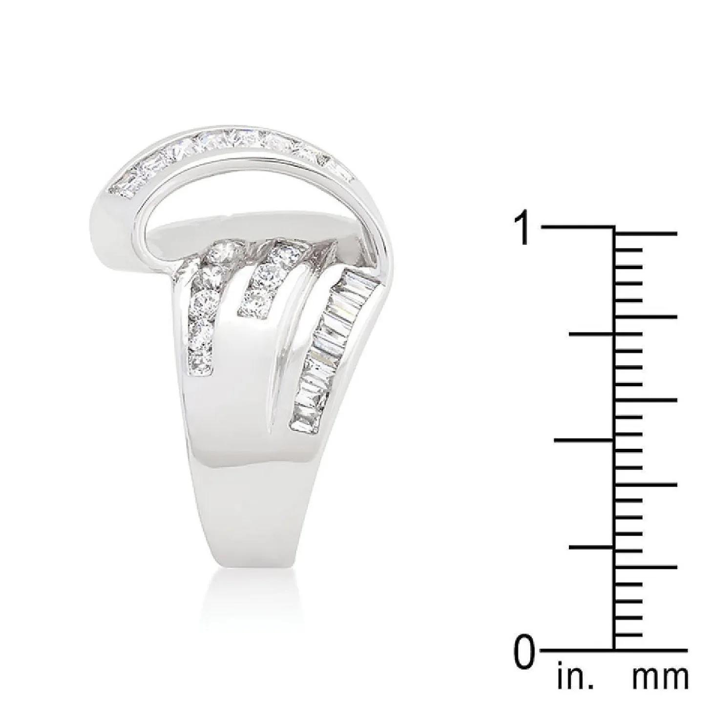 Genuine Rhodium Plated Channel Set Overlapping Fashion Ring With Round Cut And Emerald Cut Stones Polished Into A Lustrous Silvertone Finish. Channel Set Cubic Zirconia Stones In A Diagonal Design Mingle Together To Create This Classic Overlapping Cocktail Piece. Our Genuine Rhodium Finish Is Achieved Using An Electroplating Process That Coats The Item With Heavy Layers Of Rhodium A Close Cousin Of Platinum That Costs Three Times As Much Which Gives Our Jewelry A Platinum Luster.Plating Color: Silvertone Finish. Materials: Cubic Zirconia.Base Material: Lead Free Alloy (Brass). Carat Weight: 2.4 (Ct).Stone Cut: Round, Emerald. Ring Band Width: 4.3 (Mm)Size: 18.5 (Mm) X 22 (Mm) X 8.6 (Mm), Color: Clear.Stone Size: 1.4 Mmx 1.4 Mm, 2.8 Mmx 2.3 Mm