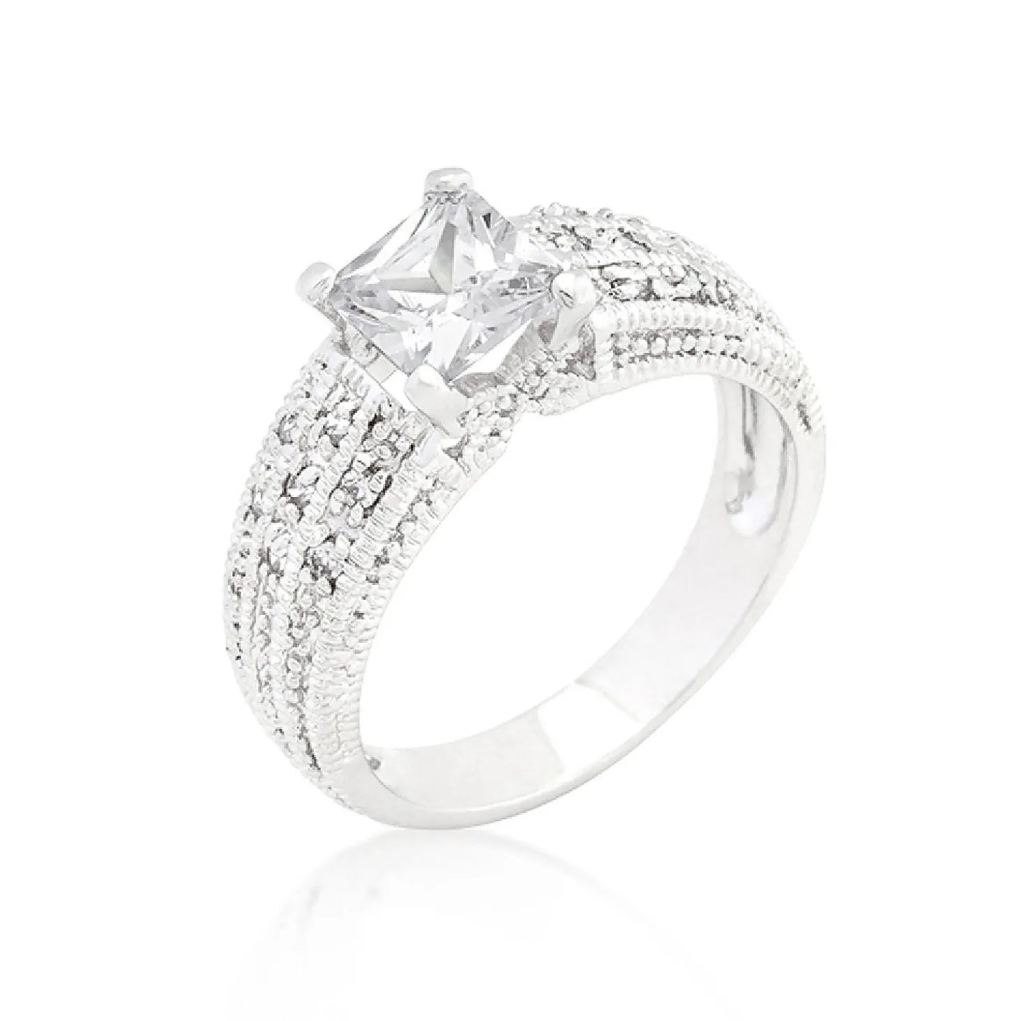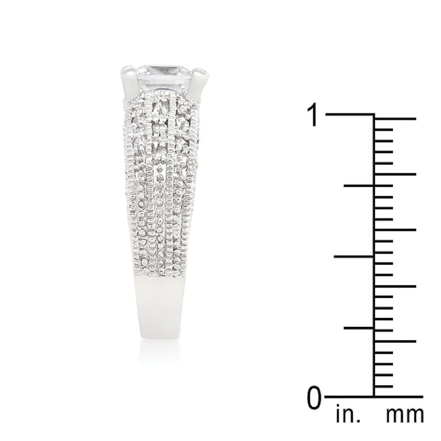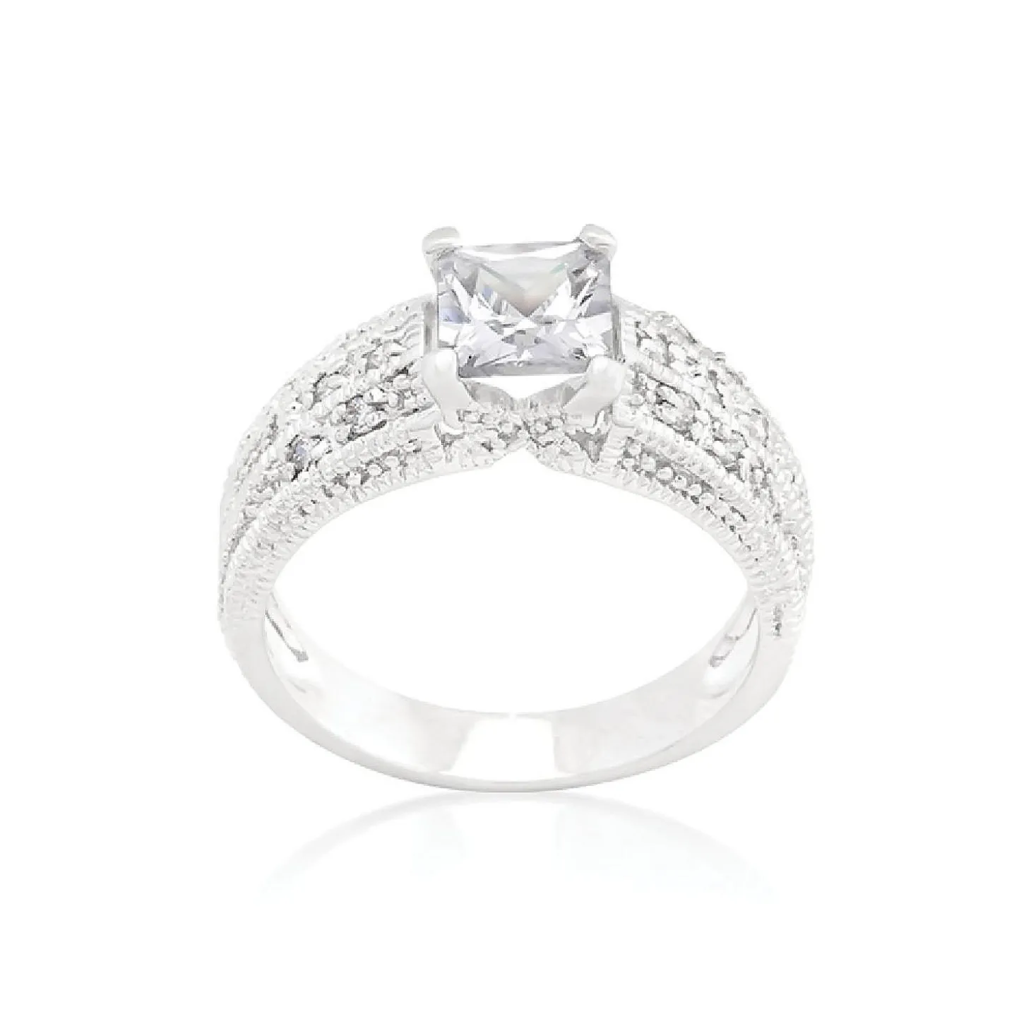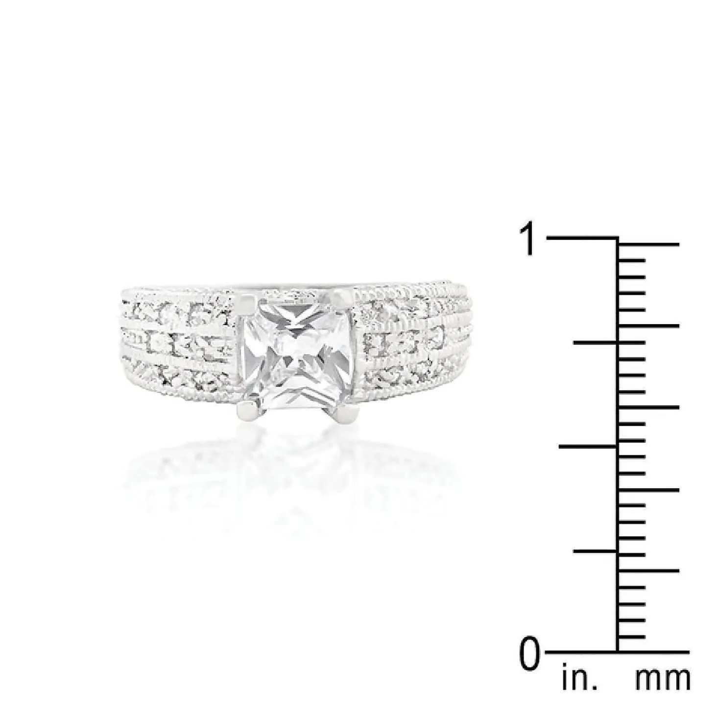 Genuine Rhodium Plated Engagement Ring With Round Cut And Princess Cut Clear Cubic Zirconia In A Circular Design Polished Into A Lustrous Silvertone Finish. Fashioned With A Princess Center Stone And Sparkling Accents This Engagement Ring Is Royally Exquisite. Our Genuine Rhodium Finish Is Achieved Using An Electroplating Process That Coats The Item With Heavy Layers Of Rhodium A Close Cousin Of Platinum That Costs Three Times As Much Which Gives Our Jewelry A Platinum Luster.Plating Color: Silvertone Finish. Materials: Cubic Zirconia.Base Material: Lead Free Alloy (Brass). Carat Weight: 1.4 (Ct).Stone Cut: Princess, Round. Ring Band Width: 3.3 (Mm)Stone Size: 5.7 Mmx 5.7 Mm, 1 Mmx 1 Mmsize: 6.9 (Mm) X 20.8 (Mm) X 5.6 (Mm), Color: Clear.