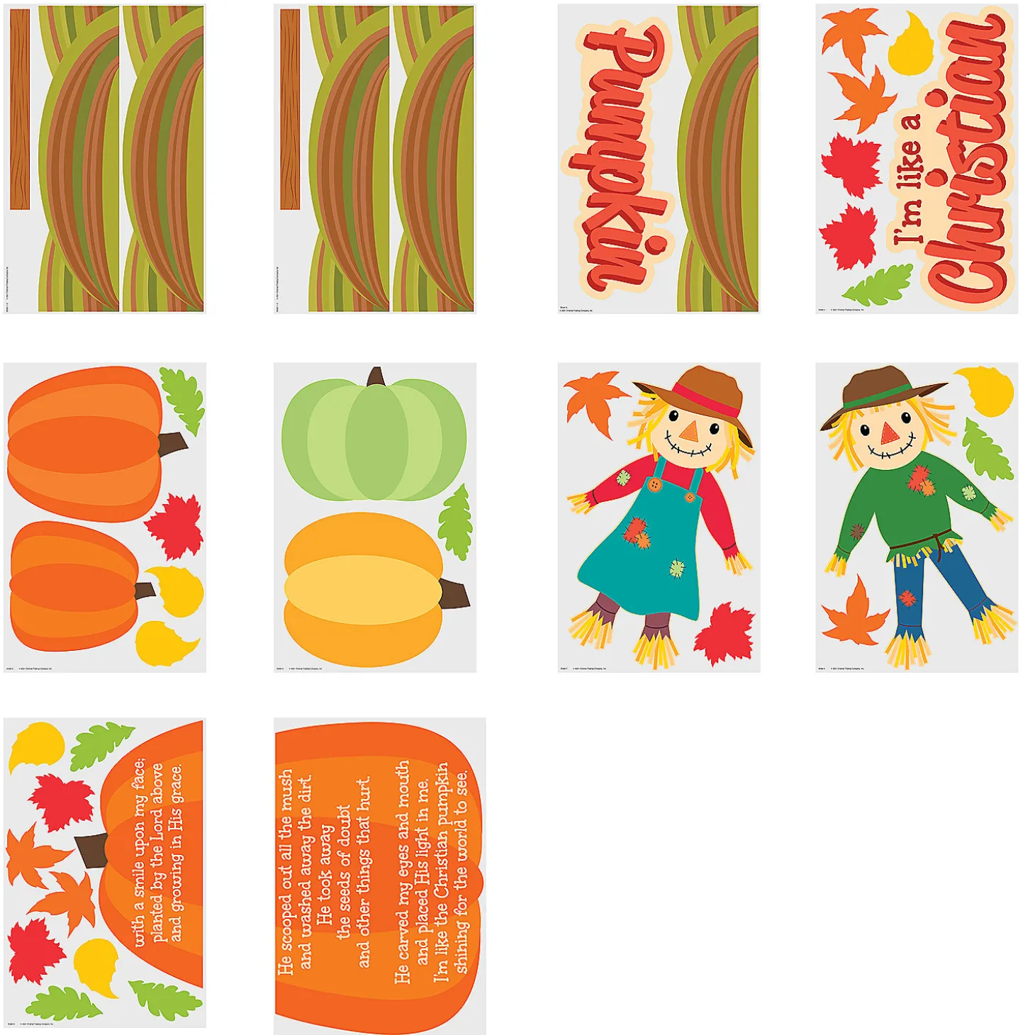 Fall Into Autumn With This Beautiful Addition To Your Fall Classroom Decor! Smiling Scarecrows, Falling Leaves And Brightly Colored Pumpkins Adorn This Bulletin Board Set That Also Features A Christian Message Perfect For Any Sunday School Or Parochial Classroom. Use This Set As A Background On Which To Hang Student Artwork, Display Impressive Scores Or Just To Feast Your Eyes On! Includes Cutouts On Ten 16″ X 24 1/2″ Sheets. Cardstock. (29 Pcs. Per Set) © Otc
