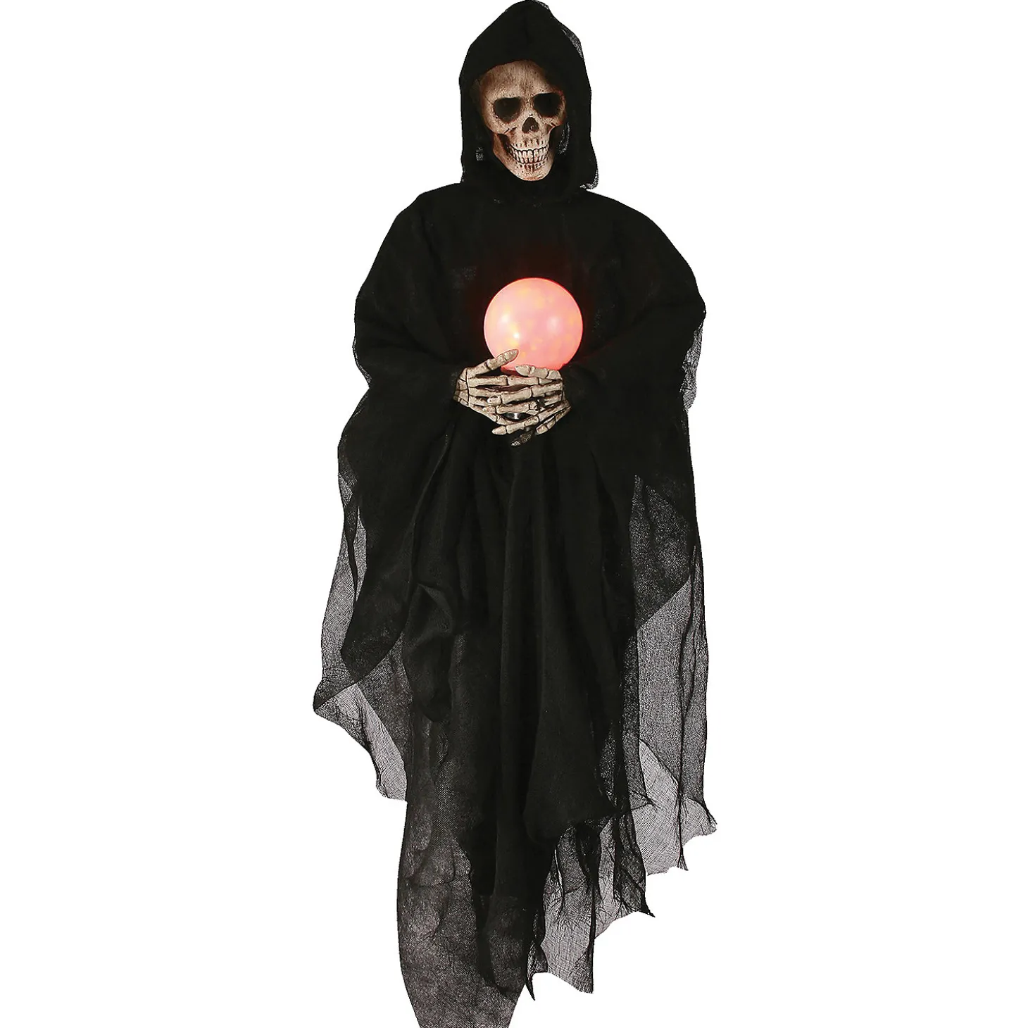 Let Your Guest And Trick-Or-Treaters Gaze Into The Crystal Ball Of The Grim Reaper And See Their Future, Or How Long It Might Be! Haha! Hanging Skeleton Prop Is 36 Inches Long With Skull And Hands Wrapped In A Black Tattered Cloak. The Skeleton Is Holding A Glowing Red/Orange Globe That Lights Up With 3 Aaa Batteries, Not Included. You’Ll Be Giving Your Decorations A Deadly Touch By Incorporating This Ghastly Fortune Teller Into The Mix!