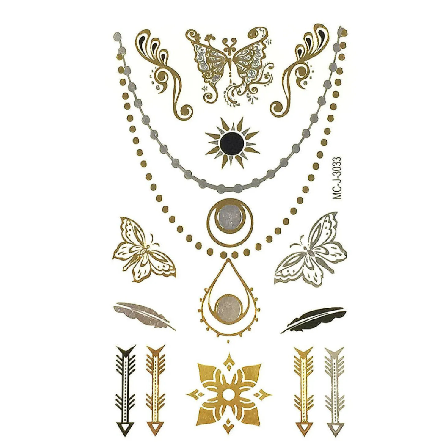 Decorate Your Body With These Exotic Temporary Tattoos That Are Inspired By Celebrities. These Tattoos Come In Shimmery Gold, Silver, And Black Colors In A Number Of Designs And Patterns. They Can Be Worn In Place Of Jewelry At The Beach / Poolside, While Clubbing, Or To Special Events. How To Apply: 1. Cut Out The Tattoo You Want To Use And Remove The Transparent Film. 2. Place The Tattoo Face Down On Your Skin. 3. Wet The Tattoo Thoroughly With A Sponge Or Damp Cloth. 4. Peel The Paper Gently To See If It Transferred (About 30 Seconds). If Not, Press Down And Wet Again. 5. Gently Remove The Paper And Allow The Tattoo To Dry. To Remove: Rub With Cold Cream, Baby Oil, Makeup Remover, Or Alcohol.Make A Statement With These Celebrity Inspired Temporary Tattoos In Metallic Gold, Silver, And Black.Wear These Tattoos In Place Of Jewelry. Great For At The Beach / Poolside, Clubbing, Or Special Events.Available In Numerous Designs And Patterns.Dimensions: Small 7.5 X 3.75 Incheseasy To Apply, Just Use Water.