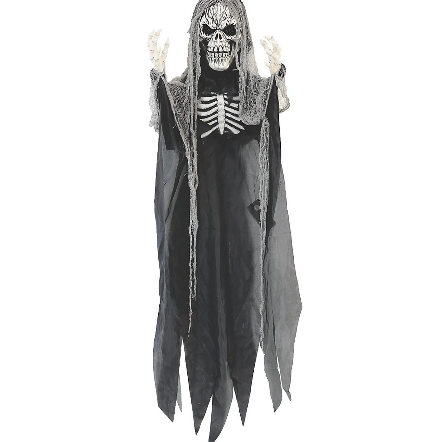 Bring Your Haunted Display To Life With This Spine-Chilling Reaper Decoration. This Hanging Skeleton Reaper Will Be The Perfect Addition To Your Halloween Home Decor. At 6 Feet Tall, This Terrifying Reaper With Glowing Red Eyes Is Sure To Cause Quite A Scare. The Poseable Arms Reach Out As It They Are Going To Grab You! The Light-Up Reaper Prop Features A 6′ Skeleton Reaper Draped In A Tattered Black And Gray Robe With Exposed Rib Cage, A Gray Gauze Shroud And Long-Fingered Skeletal Hands. Measures Approximately 72″ L X 47″ W X 8″ T. Requires 3 Aaa Batteries (Not Included).