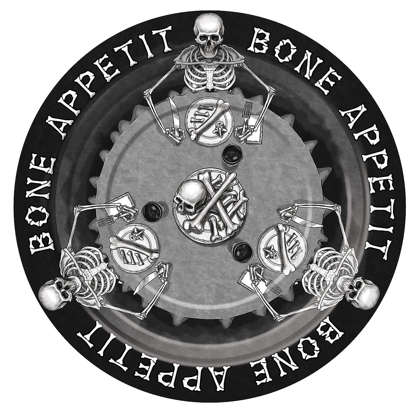 Bone Appetit Paper Dinner Plates. Great For Halloween Or Gothic Themed Parties! Featuring Four Skeletons, These Black, Grey And White Plates Are A Great Serving Idea For Your Halloween Party! (8 Pieces Per Unit) 9″