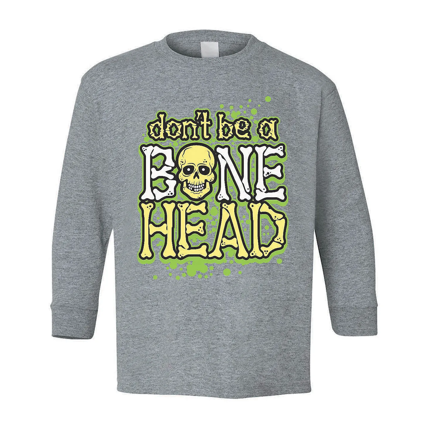 If There’s Any Time Of The Year When It’s Fashionable To Be A Bonehead, It’s Halloween! This Fun Halloween Kids’ Shirt Has The Image Of A Skeleton And The Message, “Don’T Be A Bonehead”. A Great Choice For A Halloween Shirt When A Costume Isn’T An Option, This Shirt Will Make Kids Laugh! © Otc• Brand: Gildan• Long Sleeve• Preshrunk 100% Cotton, 5.3 Oz.• Seamless Three-Quarter Collar• Taped Neck And Shoulders• Tear Away Label• Double-Needle Collar, Sleeve And Bottom Hems• Rib Cuffs• Cpsia Tracking Label Compliant• Need More? With Our Tees, We’Ve Got Your Back (And Front)! To Order In Bulk For Any Size Group, Just Call 1-877-513-0384. Or, Give Us A Ring If You’D Like To Easily Customize Any Of Our Pre-Printed Shirts With Our Free Design Service.