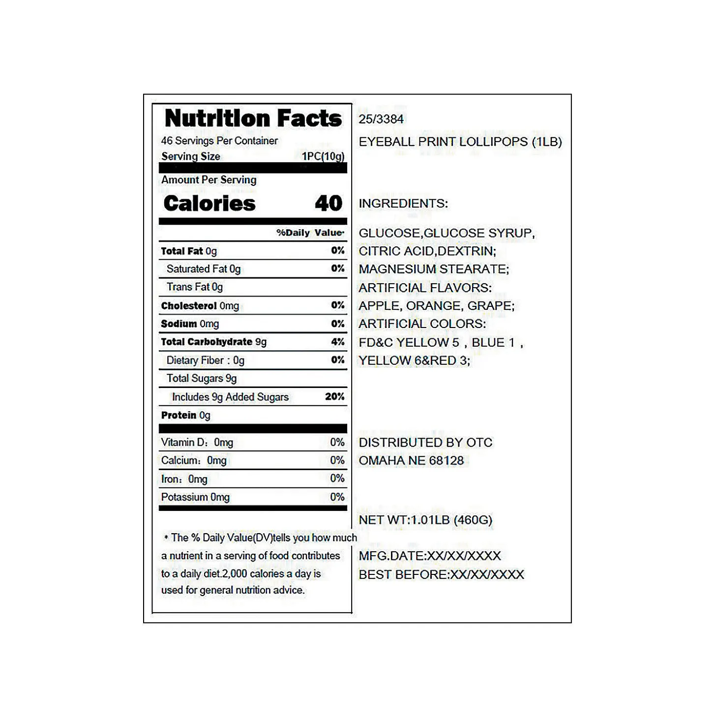 • Goody Bag Fillers: Add A Sweet Surprise To Your Halloween Party Goody Bags By Stuffing Them With Pieces Of Candy Or Other Edible Goodies, Ensuring That Each Guest Leaves With A Delightful Treat To Enjoy Later.• Scary Snack Attack: Fill Up Your Halloween Treat Bowls With Our Delicious Candy Or Treat Options, Delighting Trick-Or-Treaters And Party Guests With A Tempting Assortment Of Goodies.• Cupcake Decoration: Top Off Your Halloween Cupcakes With Our Small Candies, Turning Them Into Miniature Works Of Art That Are Too Cute (And Delicious) To Resist.Product Description:Eyeball Print Lollipops. Add Some “Vision” To Halloween Goody Bags Or Candy Dishes With These Bloodshot Eyeball Lollipops! Little Ghosts And Goblins Love Getting These Body Part Pops On Trick-Or-Treat Night! Individually Wrapped. Fat-Free. © Otc• Candy Is Non-Returnable. For More Information, Visit Our “Return Policy” Page Located On Our Website. • Ingredient, Nutrition, Allergen And Other Product Information Are Provided On Our Web And Mobile Sites For Reference Purpose Only, Without Warranty Or Representation As To Accuracy. Manufacturers Adjust Their Labeling Regularly And Are Solely Responsible For The Accuracy Of The Information. For General Questions Concerning These Items, Please Contact Our Customer Service At 800-228-0475.Size: Each Assorted 1″ Lollipop Is On A 3″ Stick. Total Wt., 1 Lb.Quantity: 46Assorted Fruit Flavors.