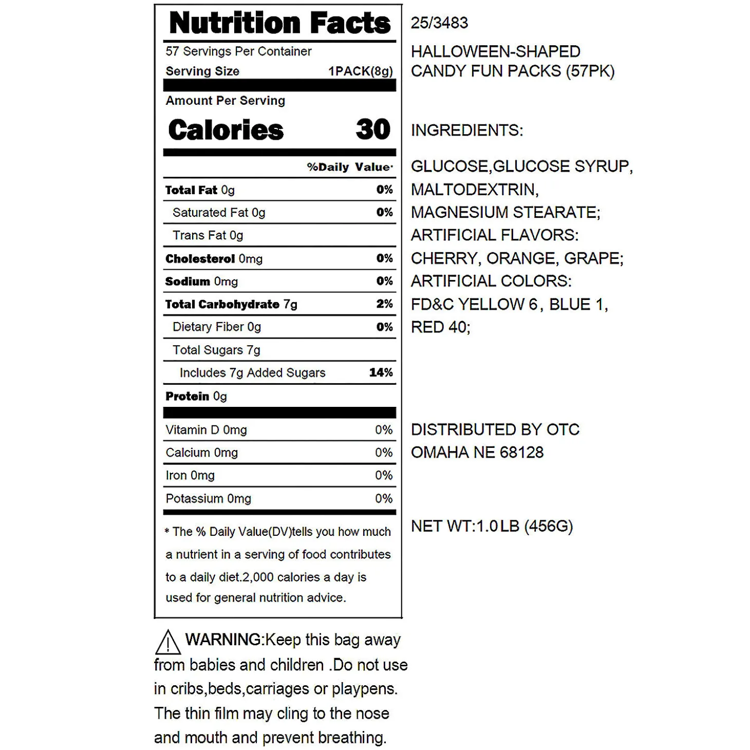 • Goody Bag Fillers: Add A Sweet Surprise To Your Halloween Party Goody Bags By Stuffing Them With Pieces Of Candy Or Other Edible Goodies, Ensuring That Each Guest Leaves With A Delightful Treat To Enjoy Later.• Game Prizes: Make Your Halloween Party Even More Exciting By Offering Candy And Other Treats As Prizes For Thrilling Games Such As A Candy Scavenger Hunt Or A Ghoulish Guessing Game.• Tasty Options For Trunk-Or-Treat: Find 1000S Of Delectable Candy And Treat Options On Our Website To Fill Up Your Handout Buckets And Delight Kids Of All Ages.Product Description:Add These Treat Packs To A Halloween Candy Dish, Pass Them Out To Trick-Or-Treaters Or Put Them In Party Goody Bags! Each Bag Has Sweet Candies Shaped Like Jack-O’-Lanterns, Moons, Ghosts And Bats. Fat-Free. • Candy Is Non-Returnable. For More Information, Visit Our “Return Policy” Page Located On Our Website.• Ingredient, Nutrition, Allergen And Other Product Information Are Provided On Our Web And Mobile Sites For Reference Purpose Only, Without Warranty Or Representation As To Accuracy. Manufacturers Adjust Their Labeling Regularly And Are Solely Responsible For The Accuracy Of The Information. For General Questions Concerning These Items, Please Contact Our Customer Service At 800-228-0475.Size: Total Wt., 1 Lb.Quantity: 8 Pcs. Per Pack, 57 Packs Per Unitcolors And Flavors Are As Follows: White: Cherry Flavor; Orange: Orange Flavor; Purple: Grape Flavor.