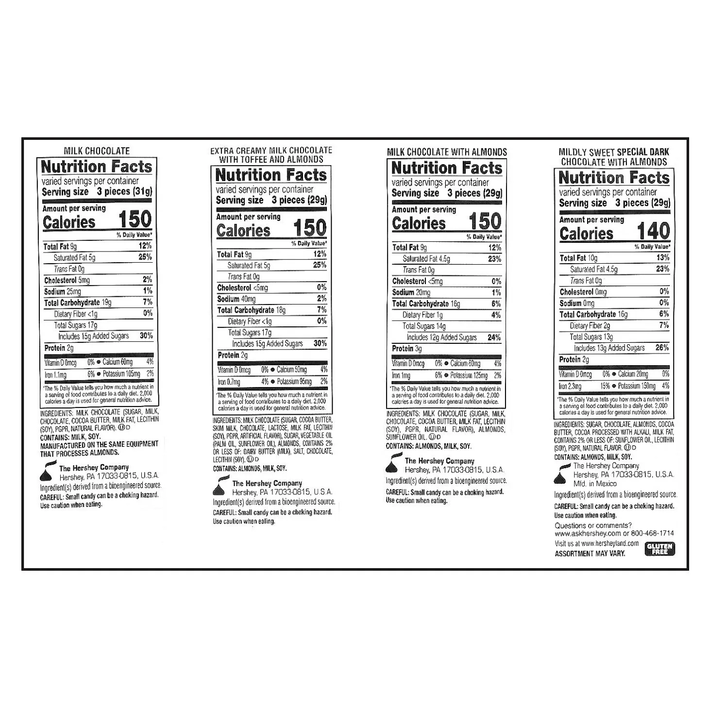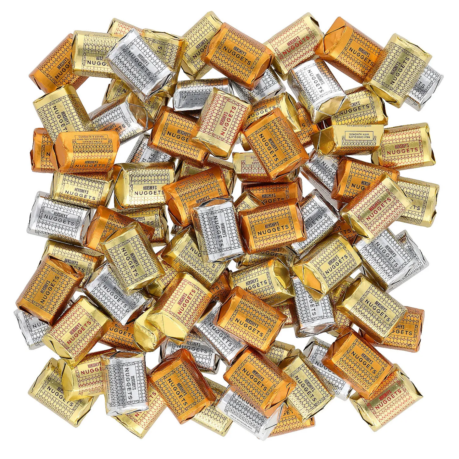 Bite Into These Awesome Nuggets Of Delight! This Great Assortment Includes Four Varieties Of Nuggets: Extra Creamy Milk Chocolate With Toffee And Almonds, Special Dark Mildly Sweet Chocolate With Almonds, Milk Chocolate And Milk Chocolate With Almonds. Make Sure You Have Enough For Halloween Trick-Or-Treaters, Easter Egg Fillers, Valentine’s Day Treat Exchanges And Every Other Candy Occasion. Individually Wrapped. (100 Pcs. Per Unit) Total Wt., 31 Oz. Assortment May Vary. © The Hershey Company• Gluten.• Kosher.• Candy Is Non-Returnable. For More Information, Visit Our “Return Policy” Page Located On Our Website.• Made In The Usa. Important Country Of Origin Information: For Certain Items Sold By Otc On Our Web Or Mobile Sites, Country Of Origin Information Can Change And What Is Displayed May Not Be Accurate Or Consistent With Manufacturer Information. For Up To Date Country Of Origin Information, It Is Recommended That You Rely On Product Packaging Or Other Manufacturer Information.• Ingredient, Nutrition, Allergen And Other Product Information Are Provided On Our Web And Mobile Sites For Reference Purpose Only, Without Warranty Or Representation As To Accuracy. Manufacturers Adjust Their Labeling Regularly And Are Solely Responsible For The Accuracy Of The Information. For General Questions Concerning These Items, Please Contact Our Customer Service At 800-228-0475.