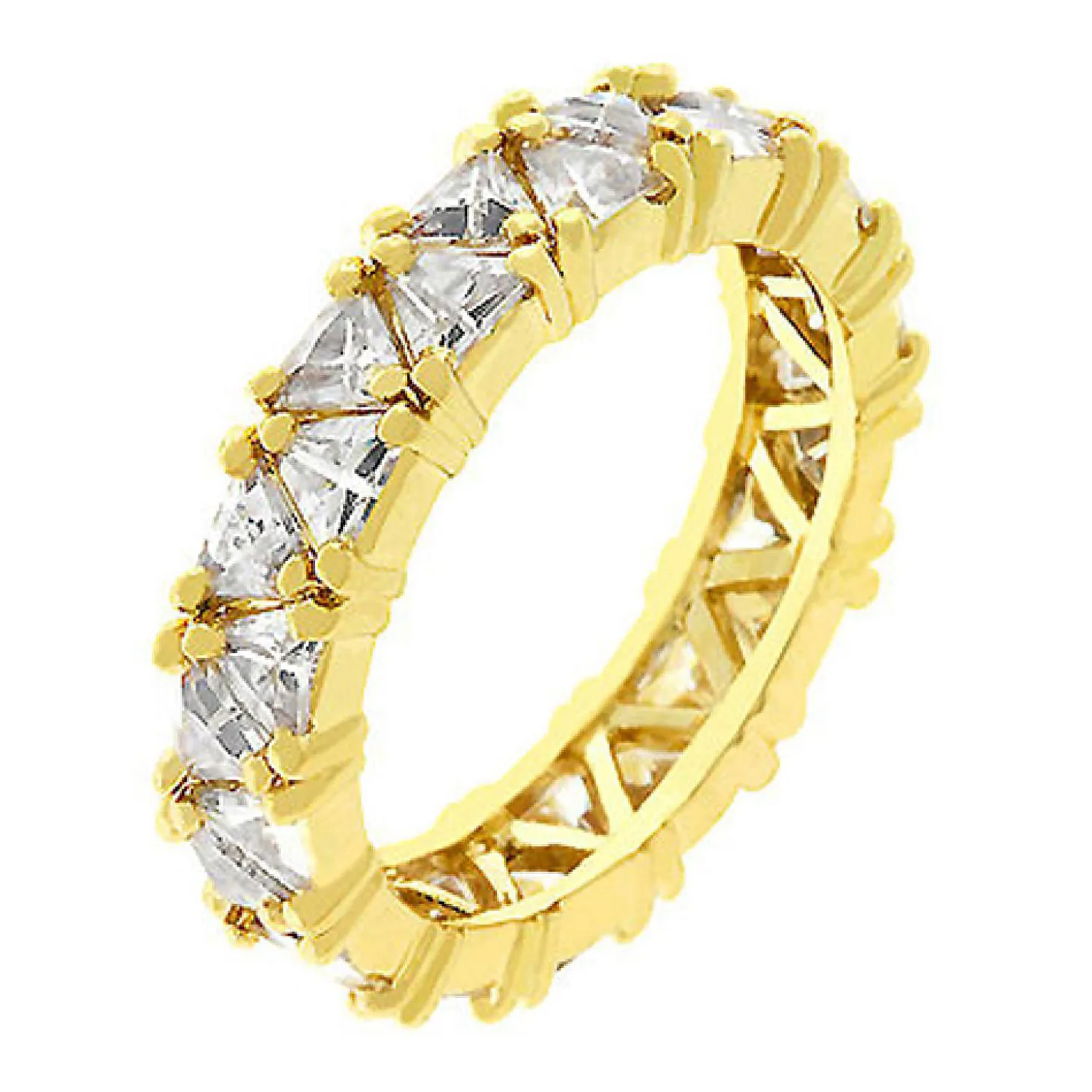 18K Gold Plated To An Eternity Style Ring Featuring Pave Trillion Cut Clear Cubic Zirconia Polished Into A Lustrous Goldtone Finish. Golden Trillion Eternity Band Features Pave Trillion Cut Champagne Cubic Zirconia Stones On A Gold Tone Band. 18K Plated Gold Is Achieved Using An Electroplating Process That Coats The Item With Heavy Layers Of 18K Yellow Gold And Color-Treated To Display A Perfect 14K Hamilton Gold Color.Basemetal: Lead Free Alloy (Brass). Style: Eternity.Materials: Cubic Zirconia. Setting Type: Prongs.Plating Color: Goldtone Finish.Audience: Women.Country Of Origin: China.
