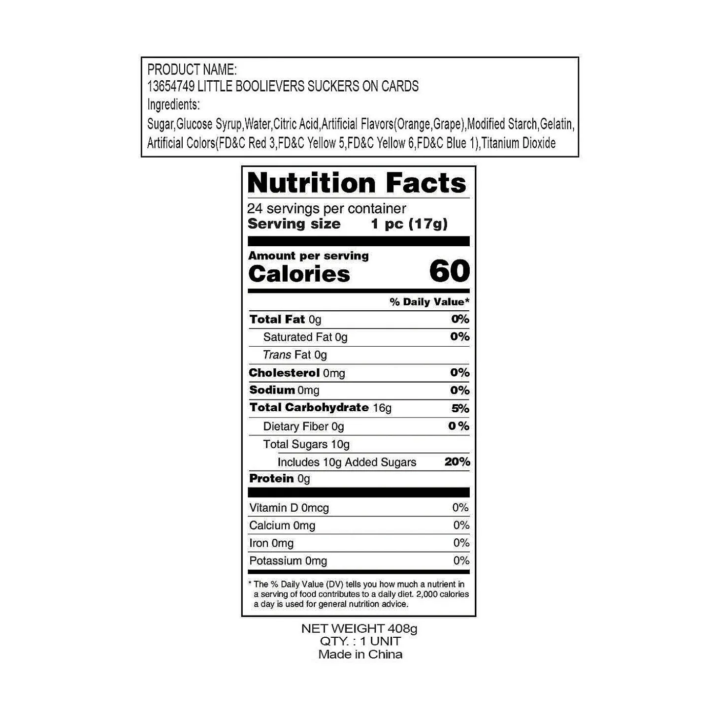 • Goody Bag Fillers: Add A Sweet Surprise To Your Halloween Party Goody Bags By Stuffing Them With Pieces Of Candy Or Other Edible Goodies, Ensuring That Each Guest Leaves With A Delightful Treat To Enjoy Later.• Spooktacular Candy Buffet: Create A Spine-Chilling Candy Buffet With Our Vast Selection Of Sweets, Offering A Variety Of Flavors, Colors, And Textures That Will Leave Your Guests In Awe.• Tasty Options For Trunk-Or-Treat: Find 1000S Of Delectable Candy And Treat Options On Our Website To Fill Up Your Handout Buckets And Delight Kids Of All Ages.Product Description:Send Your Little Boolievers Home With A Tasty Reminder Of Jesus With These Little Boolievers Pops. Each Sucker Includes A Fun Card With A Joyful Statement About Jesus. These Pumpkin-Shaped Lollipops Are A Unique Giveaway During Trunk Or Treat Events Or During Sunday School. Individually Wrapped. Fat-Free. Simple Assembly Required. © Otc• Candy Is Non-Returnable. For More Information, Visit Our “Return Policy” Page Located On Our Website. • Ingredient, Nutrition, Allergen And Other Product Information Are Provided On Our Web And Mobile Sites For Reference Purpose Only, Without Warranty Or Representation As To Accuracy. Manufacturers Adjust Their Labeling Regularly And Are Solely Responsible For The Accuracy Of The Information. For General Questions Concerning These Items, Please Contact Our Customer Service At 800-228-0475.Size: Includes 2″ Pumpkin-Shaped Pops On 4″ Plastic Sticks. Each Comes With A 3″ X 3″ Paper Card. Total Wt., 14 Oz.Quantity: 24Grape And Orange Flavors.