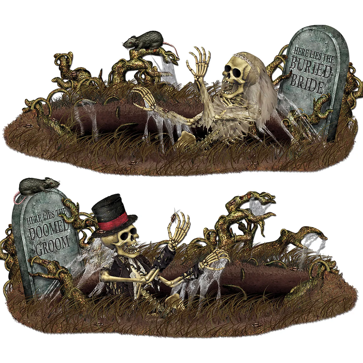 Doomed Groom And Buried Bride Prop. Create An Instant Cemetery Theme With Wall Designs. Includes: 2 Scenes Included, One With Skeleton Groom Emerging From Grave And The Other With The Skeleton Bride Doing The Same Thing. Polypropylene. 33 1/2 X 5Ft 3In. Scissors Required To Cut Out Pieces. 1 Sheet With Buried Bride, 1 Sheet With Doomed Groom. Pins/Adhesive Required.