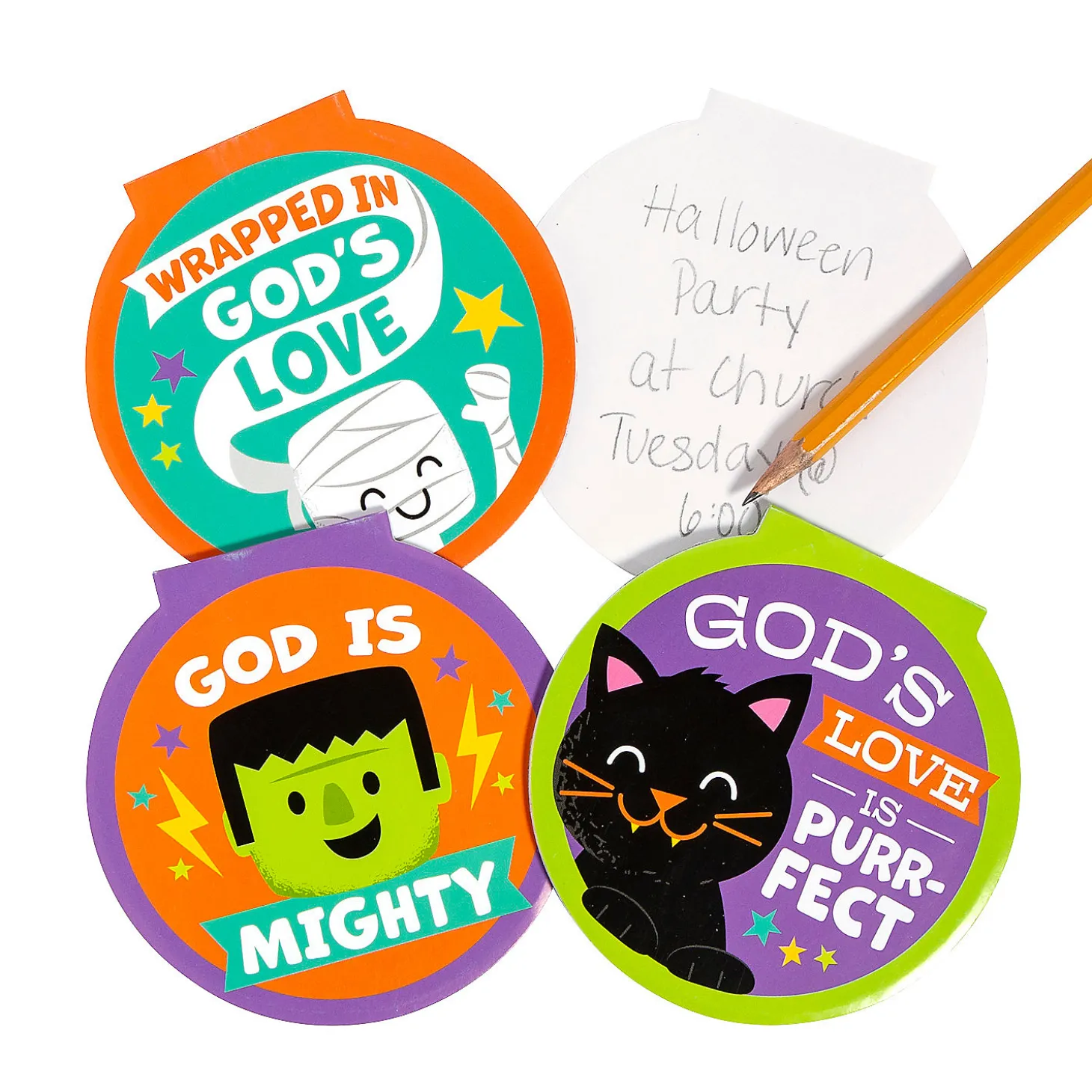 God’s Love Is Purr-Fect And So Are These Cute Notepads! These Notepads Feature An Assortment Of Halloween Designs And Faith-Inspired Messages Like “God Is Mighty” And “Wrapped In God’s Love”. This Stationery Is A Great Handout And Candy Alternative For Trunk-Or-Treat Events And Fall Festivals. Hand These Out As Halloween Party Favors Or Prizes In The Classroom, Sunday School Or At Home. Paper. (2 Dozen Per Unit) 4″ X 4″ 25 Blank Pgs. © Otc