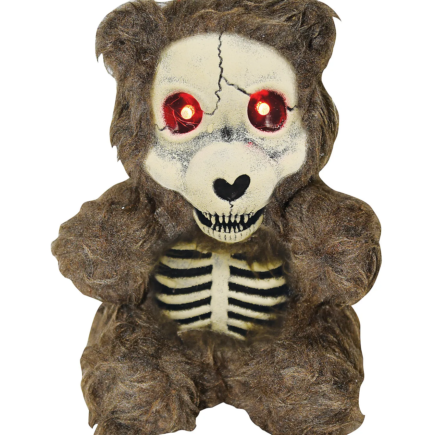 The Perfect Addition To Any Haunted House Or Horror Themed Party! Cute 7″ Teddy Bear Has A Cracked Skull Face And Skeleton Ribs Showing. Eyes Light Up Red! Requires 3 Ag13 Batteries, Not Included. Measures 7 In X 6 In X 6 In.