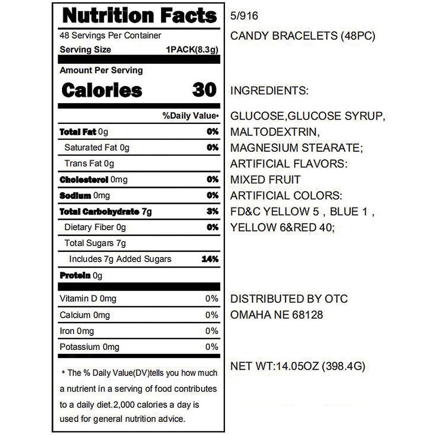 • What’s Included: This Set Includes 48 Individually Wrapped Hard Candy Bracelets. Each Has An Elastic Bracelet Ringed In Mixed Fruit Flavored Hard Candies Of Various Colors. Not For Kids Under Three Years Old. • Non-Returnable: Candy Is Non-Returnable. For More Information, Visit The Return Policy Page Located On Our Website.• Important Country Of Origin Information: For Certain Items Sold By Otc On Our Web Or Mobile Sites, Country Of Origin Information Can Change And What Is Displayed May Not Be Accurate Or Consistent With Manufacturer Information. For Up To Date Country Of Origin Information, It Is Recommended That You Rely On Product Packaging Or Other Manufacturer Information.• Product Information: The Candy Bracelets Are Fat-Free. Details About Ingredients, Nutrition, Allergens And Other Product Information Are Provided On Our Web And Mobile Sites For Reference Purpose Only, Without Warranty Or Representation As To Accuracy. Manufacturers Adjust Their Labeling Regularly And Are Solely Responsible For The Accuracy Of The Information. For General Questions Concerning These Items, Please Contact Our Customer Service At 800-228-0475.Product Description: A Candy Classic! Wear Your Candy On Your Sleeve With These Stretchable Hard Candy Bracelets. A Stretchy Elastic Bracelet Is Ringed With Fruity Flavored Hard Candy Pieces In Assorted Colors. They’Re As Cute To Wear As They Are Tasty! The Set Includes 48 Bracelets That Are Individually Wrapped So Are Perfect For Giving Out At Halloween And Trunk-Or-Treat Events Plus Adding Into Easter Baskets, Birthday Party Favor Bags And Christmas Stockings. Kids Of All Ages Will Happily Wear And Eat These Candy Bracelets. Specs:Size: 2 1/2″Quantity: 48Dietary Needs: Fat-Freebrand: © Otc – Oriental Trading Company