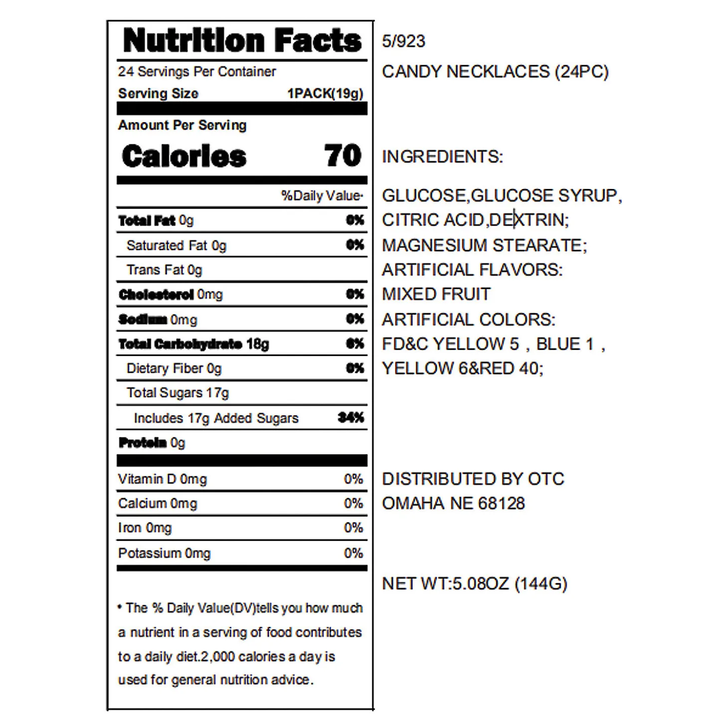 • What’s Included: This Set Includes 24 Individually Wrapped Hard Candy Necklaces. Each Has An Elastic Necklace Ringed In Mixed Fruit Flavored Hard Candies Of Various Colors. Not For Children Under Three Years Old. • Non-Returnable: Candy Is Non-Returnable. For More Information, Visit The Return Policy Page Located On Our Website.• Important Country Of Origin Information: For Certain Items Sold By Otc On Our Web Or Mobile Sites, Country Of Origin Information Can Change And What Is Displayed May Not Be Accurate Or Consistent With Manufacturer Information. For Up To Date Country Of Origin Information, It Is Recommended That You Rely On Product Packaging Or Other Manufacturer Information.• Product Information: The Candy Bracelets Are Fat-Free. Details About Ingredients, Nutrition, Allergens And Other Product Information Are Provided On Our Web And Mobile Sites For Reference Purpose Only, Without Warranty Or Representation As To Accuracy. Manufacturers Adjust Their Labeling Regularly And Are Solely Responsible For The Accuracy Of The Information. For General Questions Concerning These Items, Please Contact Our Customer Service At 800-228-0475.Product Description: Candy You Can Wear! Get A Sweet Dose Of Nostalgia From These Classic, Stretchable Hard Candy Necklaces. Each Stretchy Elastic Necklace Is Ringed With Fruit Flavored Hard Candy Pieces Of Assorted Colors. Cute And Tasty, You Won’T Be Able To Resist Nibbling On These Necklaces. The Set Includes 24 Individually Wrapped Candy Necklaces So You’Ll Have Plenty To Hand Out At Halloween And Trunk-Or-Treat Events And Adding Into Easter Baskets, Birthday Party Favor Bags And Christmas Stockings. Specs:Size: 10 1/2″Quantity: 24Dietary Needs: Fat-Freebrand: © Otc – Oriental Trading Company
