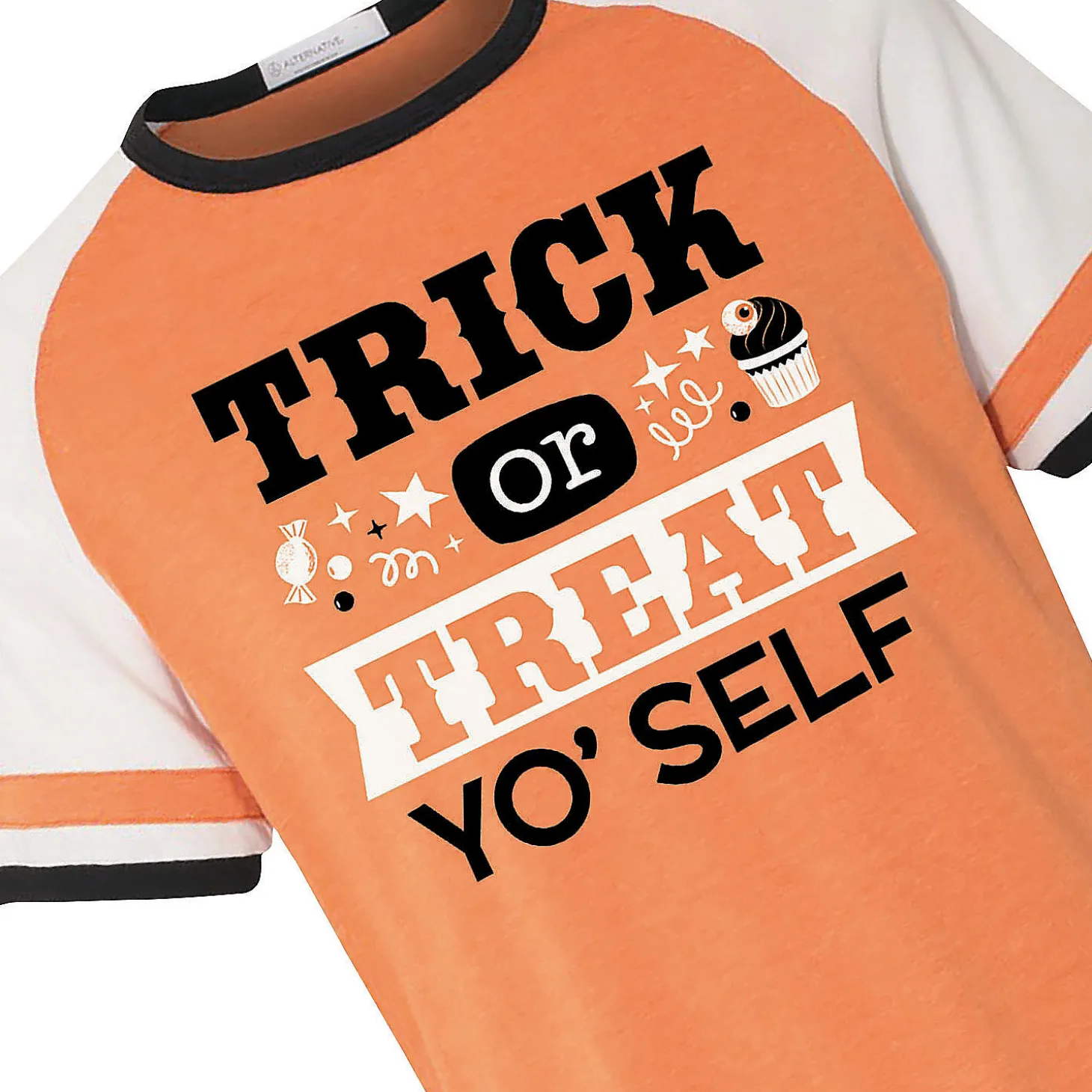 This Fashion Is More Funny Than Frightening! Printed With The Sassy Saying “Trick Or Treat Yo’self,” Halloween T-Shirts Like This Are Sure To Scare Up Some Laughs. In Fact, This Graphic Tee Makes For An Easy Halloween Costume When You Wanna Get In The Spirit But Not Dressed Head-To-Toe As You Take Little Ghouls And Boys Candy Collecting. © Otc• Brand: Bella + Canvas• Short Sleeve• Contrast Ringer Binding On Sleeves And Neckline With Side Seams • 52% Combed And Ring-Spun Cotton, 48% Poly, 30 Single 4.2 Oz.• Tearaway Label• Need More? With Our Tees, We’Ve Got Your Back (And Front)! To Order In Bulk For Any Size Group, Just Call 1-877-513-0384. Or, Give Us A Ring If You’D Like To Easily Customize Any Of Our Pre-Printed Shirts With Our Free Design Service.